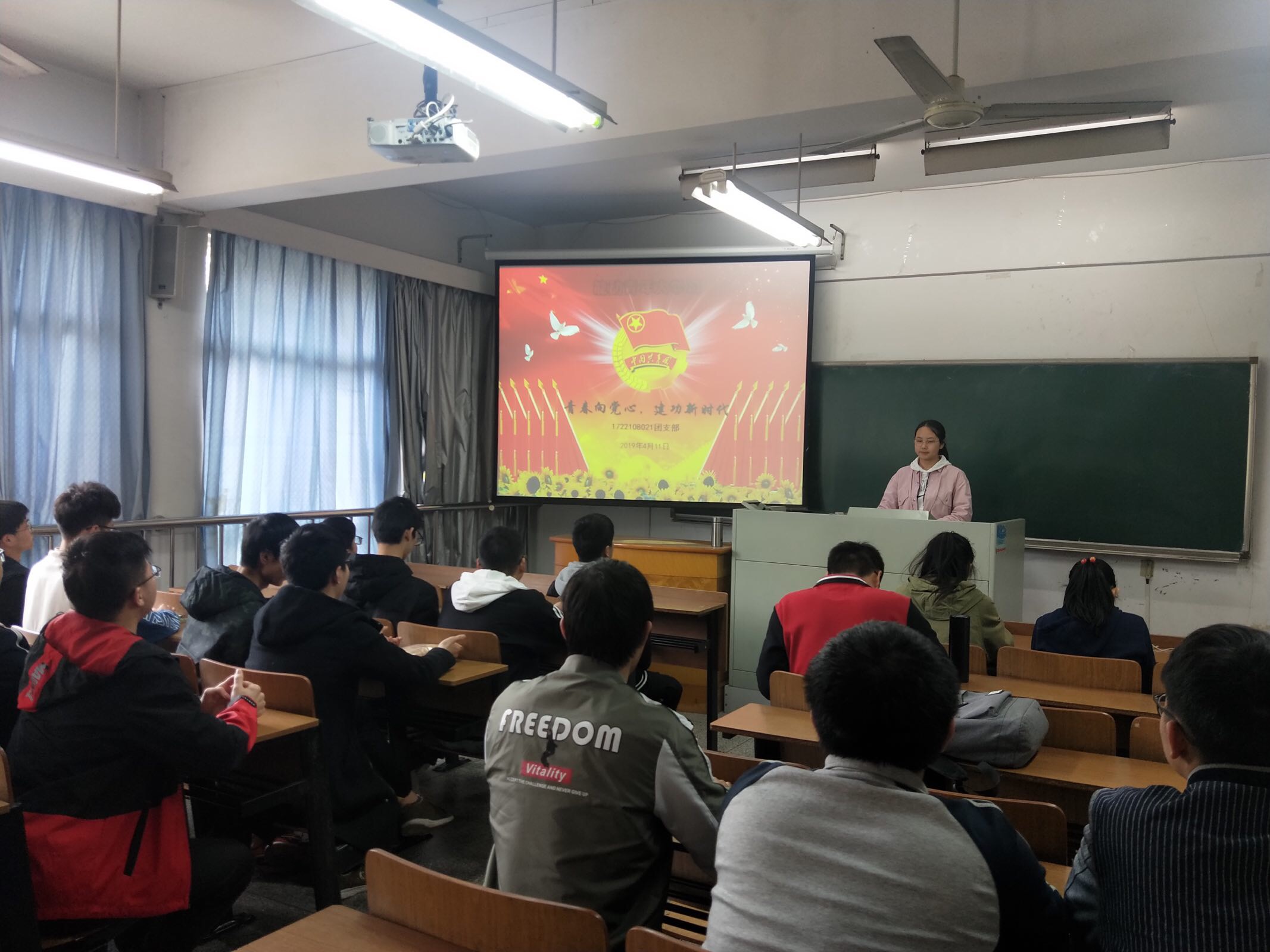 本次主题团日共分为四项议程:第一项议程、合唱团歌,团支部全体成员起立合唱团歌,蓬勃朝气的歌声中彰显着青少年的激情力量;第二项议程、响应院团委号召,每团支部分为五个小组进行以“青春心向党·建功新时代”为主题的ppt演讲,巩固了五四运动与建国历史应知应会的历史知识;第三项议程、由班长详细介绍宿舍卫生要求,为创建优良学风班做长远准备;第四项议程、由团支书进行本次主题团日活动总结。