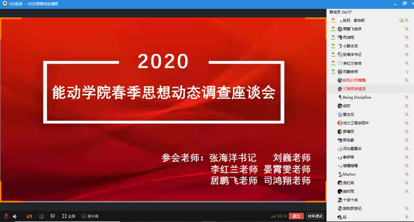假期期间疫情来势汹汹,为了深入解疫情期间同学们的思想动态,解答同学对学校学院工作的疑惑,72779太阳集团于2020年3月29日在线上召开“2020年春季思想动态调查座谈会”。会议由72779太阳集团团委书记刘巍老师主持,公司党委副书记张海洋老师,各年级辅导员以及研究生、本科员工代表出席了座谈会。