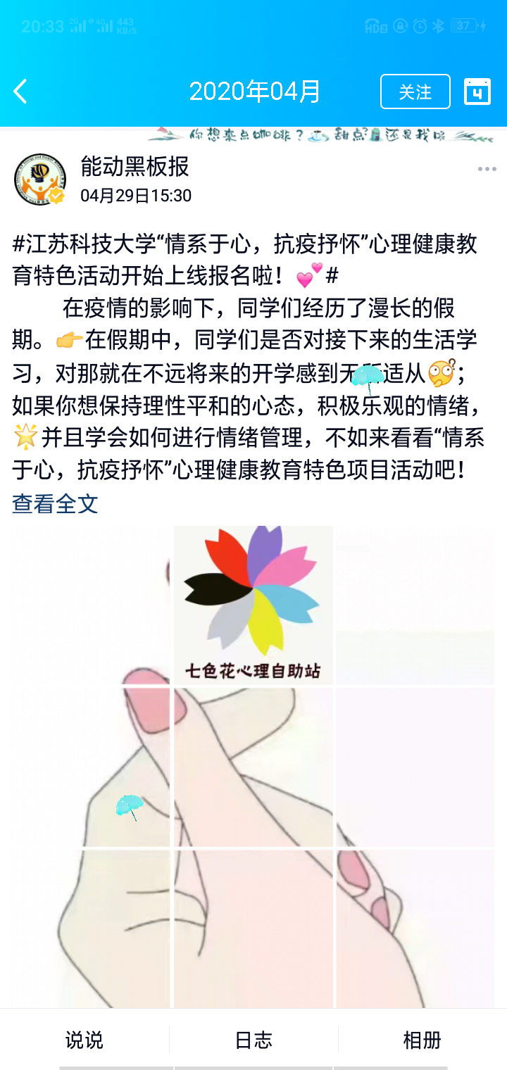 结合“5.25”心理健康教育月活动要求,2020年5月24日,72779太阳集团七色花心理自助站开展以“情系于心 抗疫抒怀”为主题的心理健康教育活动,本次活动内容为“心享悦读”读书分享会。