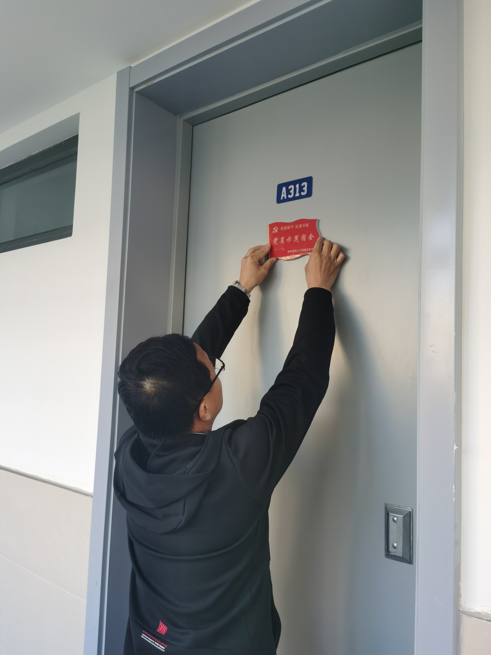 活动中,袁志飞主任亲手为党员所在寝室挂上了“党员宿舍”的牌子,走访了党员所在宿舍,此次活动是党组织对大家的一次考验,只有在学习生活中严格要求自己,才能更加紧密的联系群众,以身作则才能带动身边的同学。