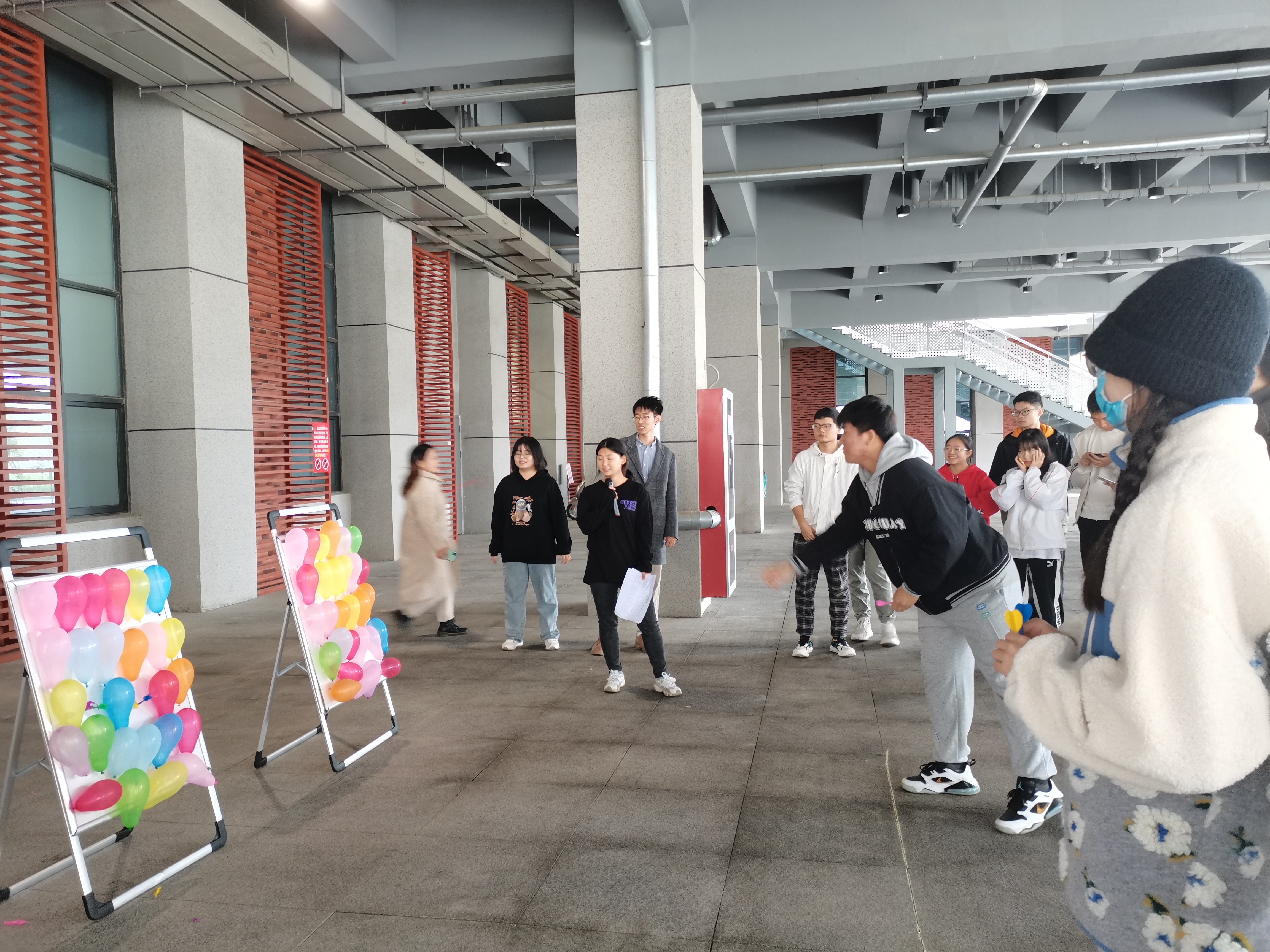 天气虽冷,但并没有阻挡同学们参加活动的热情,志愿工作者们一早就来到现场布置场地。活动开始,同学们自由组队,通过“勇掷飞镖”、“气球爆破”、“丢圈圈”等形式多样、趣闻盎然的活动释放心中的压力。“勇掷飞镖”中考验大家眼力和手劲的同时,也将大家的烦恼随风而散;“气球爆破”中大家将压力“装”进气球,随着一声声气球爆破的脆响将压力释放;“丢圈圈”中大家找准方向,通过各种方式套中目标,寓意大家不断探索、不断努力,最终实现目标。此外,学弟学妹们还用便签纸用心写下祝福语放到信封,传递到考研学长学姐手中,不仅传递了力量,传达了温暖,更让考研员工在漫长孤独的研路上感受到背后有众多“家人”在为他们加油打气。