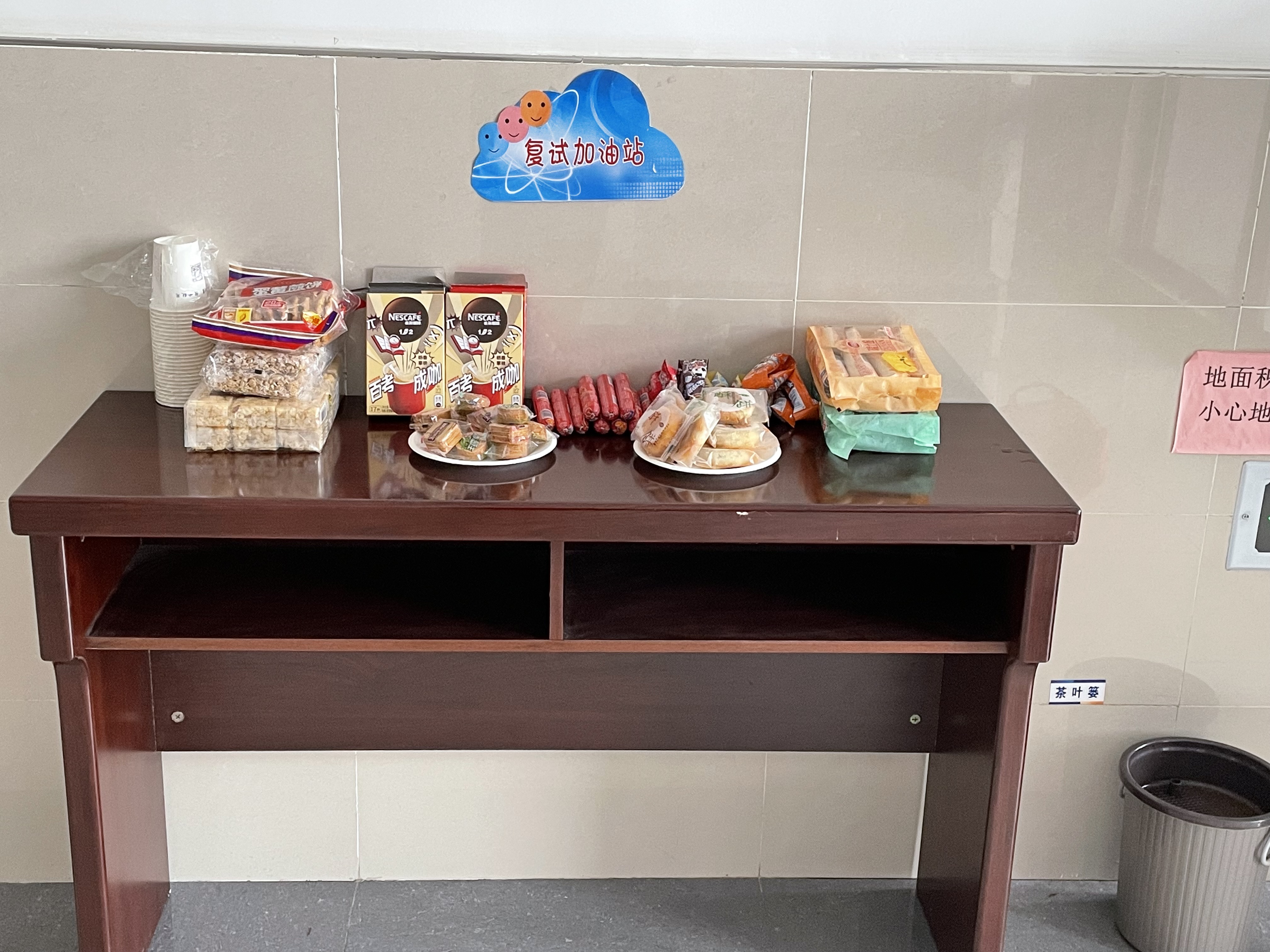 设立“考研复试加油站”,提供咖啡,茶水、面包、糖果等,为复试的学子们补充能量、加油鼓劲。