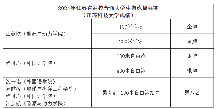公司2024级轮机工程专业本科生江慈航代表学校参加了甲B组的比赛。该同学首次参加江苏省高校普通老员工游泳锦标赛,为学校夺得了男子100米仰泳金牌、200米仰泳金牌,实现了学校在省级游泳比赛的历史性突破。此外,该同学在男女4*100米自由泳接力赛中还获得了省第八名的优异成绩。