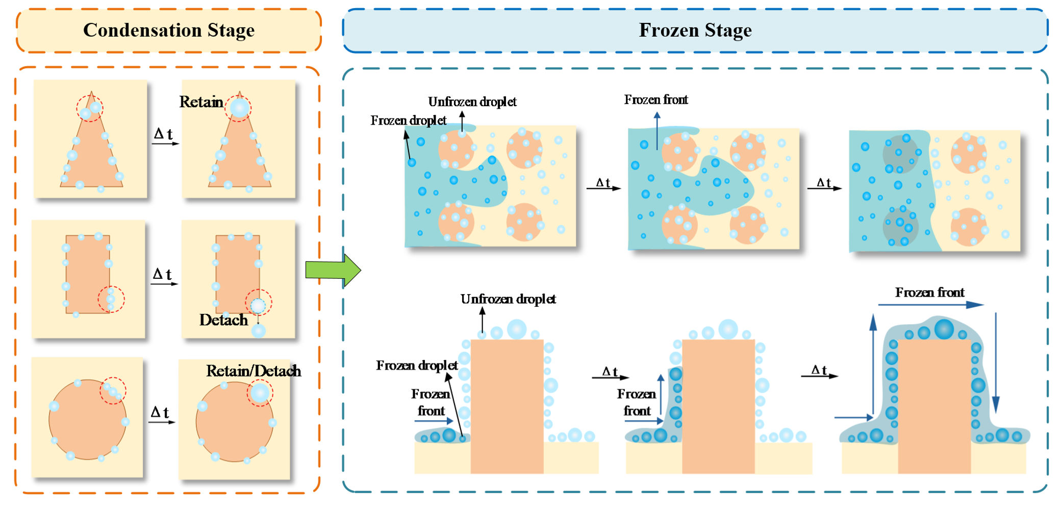 超疏水表面结霜初期凝结液滴的生长、合并以及冻结行为,会对后续的霜层生长速率产生重要影响。开发凝结液滴行为的高效调控方法,对强化超疏水表面抑霜效应具有重要意义。本工作采用纳秒激光刻蚀法在铝表面构筑了具有亚毫米尺度的各向异性微结构阵列,并结合浸渍法对具有微结构的金属基底进行全局超疏水改性。通过搭建可视化实验平台,对具有圆柱、三棱柱、长方体等典型拓扑结构的超疏水表面进行凝结-结霜实验,获取了不同表面上液滴的凝结、冻结行为特征,以及冻结波传播速率和后续霜层生长特性,揭示了微结构拓扑对多尺度液滴行为和表面结霜过程的多向作用机制。结果表明,亚毫米尺度微结构能够在凝结液滴群簇生长初期影响小尺寸液滴的合并、弹跳和多液滴合并频率,从而影响群簇尺寸分布;其各向异性则能够在液滴生长后期影响大尺度液滴的空间分布,两者共同影响液滴冻结时间和冻结波传播速率。在三种典型微结构拓扑中,三棱柱微结构具有最好的抑霜效果,相较普通超疏水表面可将表面完全冻结时间延长106.87%,霜层生长速率下降27.59%。